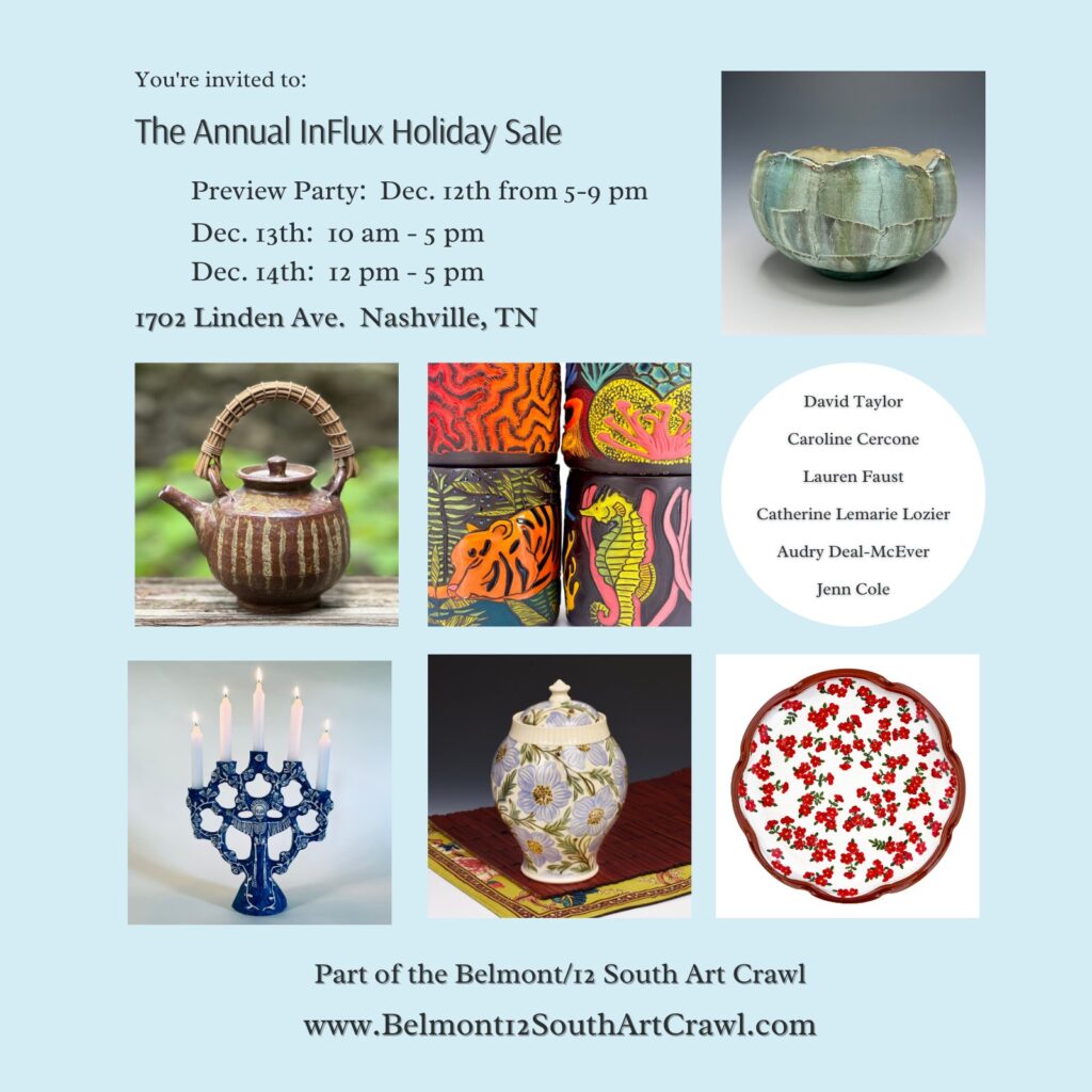 This year the InFlux Holiday Pottery Sale will be part of the Belmont 12 /South Art Crawl! We will also have a preview party for our friends on Friday Dec. 12th from 5 to 8 pm. We hope you’ll stop by and say hello!